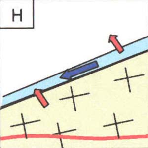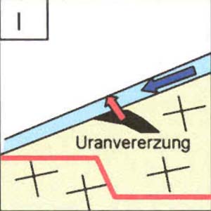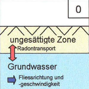 Legende: rote Pfeile symbolisieren Radonaustauschprozesse, blaue Pfeile die Grundwasserfliessrichtung inkl. - geschwindigkeit.