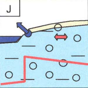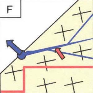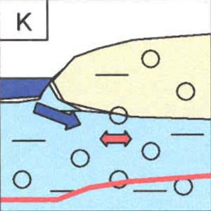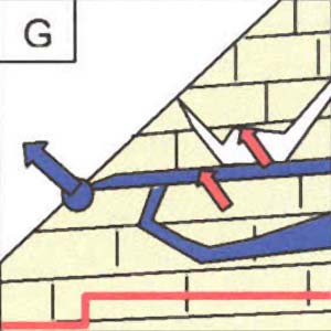 Die rote Linie gibt die vertikale Radonverteilung (A-E; zunehmende Konzentration nach rechts) respektive die horizontale Radonverteilung wieder (F-K: zunehmende Radonkonzentration nach oben).